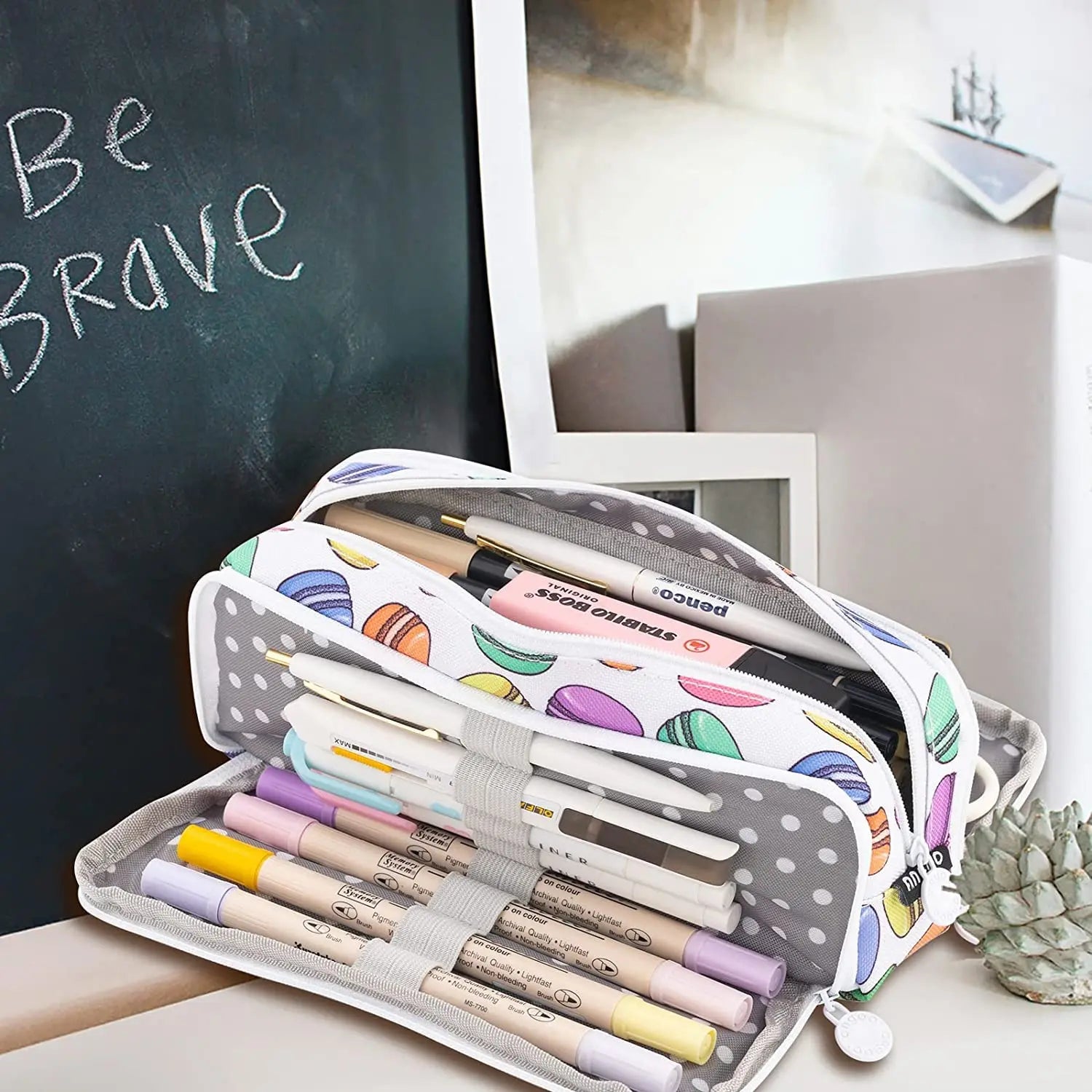 The pencil case is designed with 3 compartments. This unique design keeps items organized and accessible, so that you can quickly view all the contents inside and find exactly what you need.